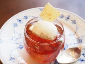 埼玉県産の完熟梅を良質のダージリンでやさしく煮た梅紅茶を香りの良いアールグレイのジュレと共にグラスへ入れ、フレッシュクリームとチョコレートでデコレーション。梅の酸味と紅茶の香り絶品です。